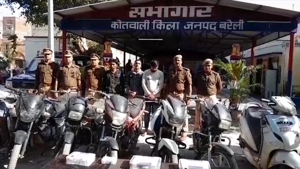 बरेली। किला पुलिस ने चोरी की बढ़ती घटनाओं पर बड़ी कार्रवाई करते हुए तीन चोरों को गिरफ्तार किया है। पुलिस ने उनके कब्जे से पांच चोरी की मोटरसाइकिलें, दो स्कूटी, एक तमंचा, तीन जिंदा कारतूस और करीब तीन हजार रुपये नकद बरामद किए। यह कार्रवाई मुखबिर की सूचना पर रघुवर दयाल गांव के गंगा मंदिर के पास की गई, जहां पुलिस ने घेराबंदी कर तीनों आरोपियों को पकड़ लिया।