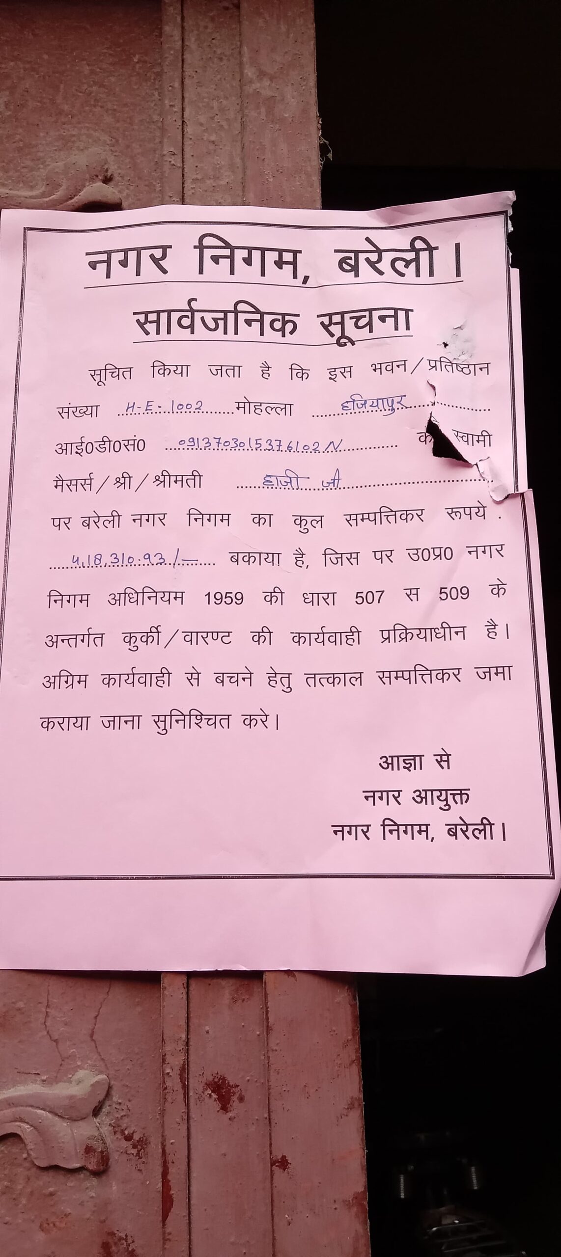 बरेली ।नगर निगम टैक्स विभाग की कार्यप्रणाली एक बार फिर सवालों के घेरे में आ गई है। हजियापुर क्षेत्र में एक प्रॉपर्टी पर बिना किसी जिम्मेदार अधिकारी या कर्मचारी के हस्ताक्षर के कुर्की वारंट चस्पा किए जाने का गंभीर मामला सामने आया है। इस कुर्की वारंट में 4,18,310.93 रुपये का बकाया दर्शाया गया है, जबकि वारंट पर न तो किसी अधिकारी का नाम है और न ही हस्ताक्षर।