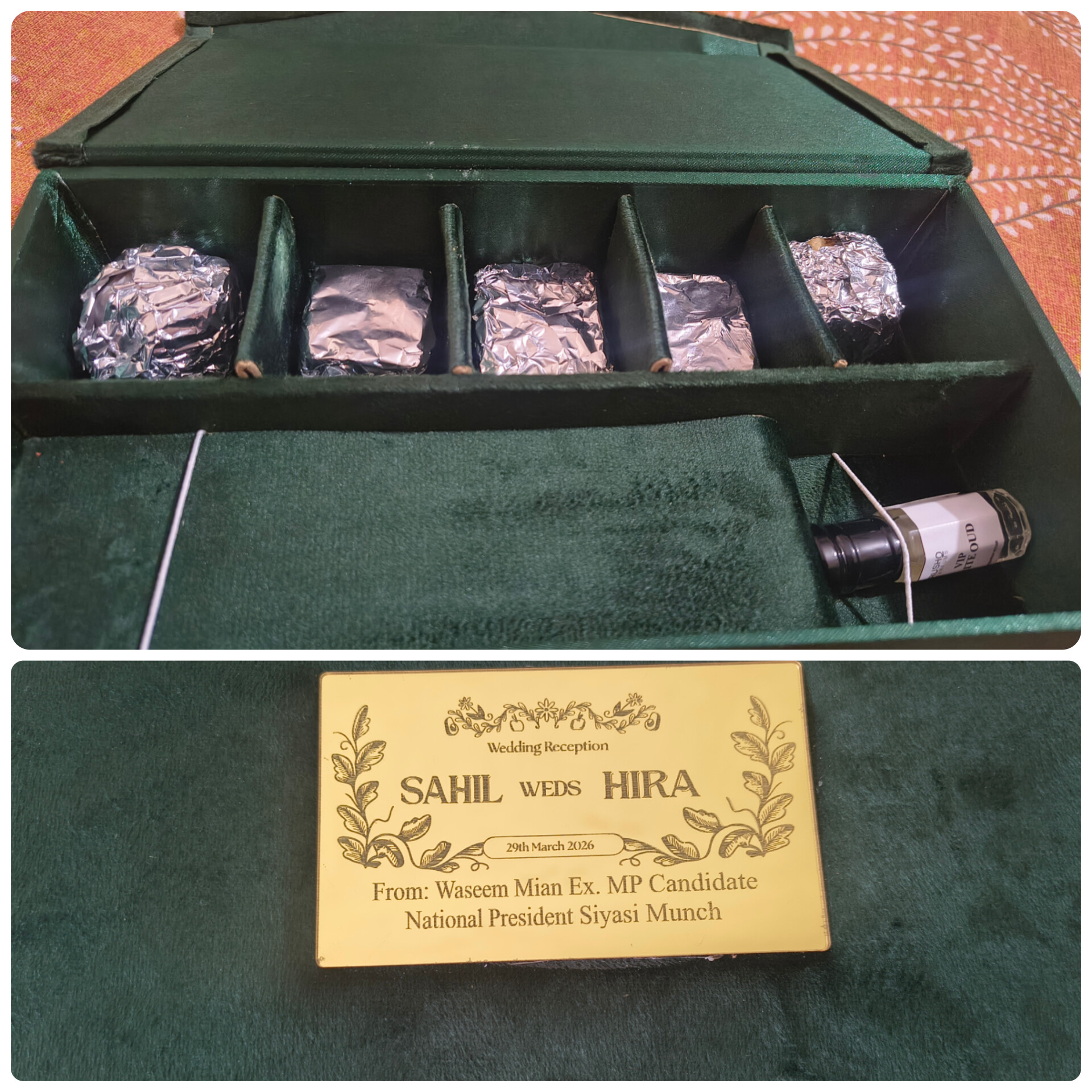 बॉक्स के ऊपर मुरादाबाद के खास मेटल वर्क से बनी प्लेट पर साहिल वेड्स हीरा को खूबसूरती से उकेरा गया है। बॉक्स खोलते ही अंदर छह अलग-अलग खाने दिखाई देते हैं, जिनमें बरेली की मशहूर मिठाइयां रखी गई हैं। साथ ही कन्नौज का इत्र भी शामिल है, जिसकी खुशबू पूरे बॉक्स में फैलकर इसे और खास बना देती है।शादी का निमंत्रण सुनहरे कपड़े पर लाल रंग से छापा गया है, जिसे पढ़कर किसी शाही फरमान जैसा एहसास होता है। यह कार्ड अपनी भव्यता और अनोखे अंदाज के कारण लोगों के बीच चर्चा में है।